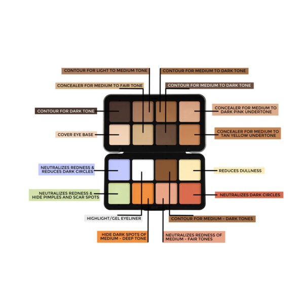 رنگ های روشن آن برای محو کردن برجستگی ها، رنگ های تیره مناسب برجسته کردن فرورفتگی ها، رنگ نارنجی، رفع کبودی و تیرگی و لک ها، رنگ سبز رفع قرمزی مانند جای جوش، رنگ بنفش خنثی کردن تیرگی های پوست، رنگ زرد رفع قرمزی و صورتی پوست